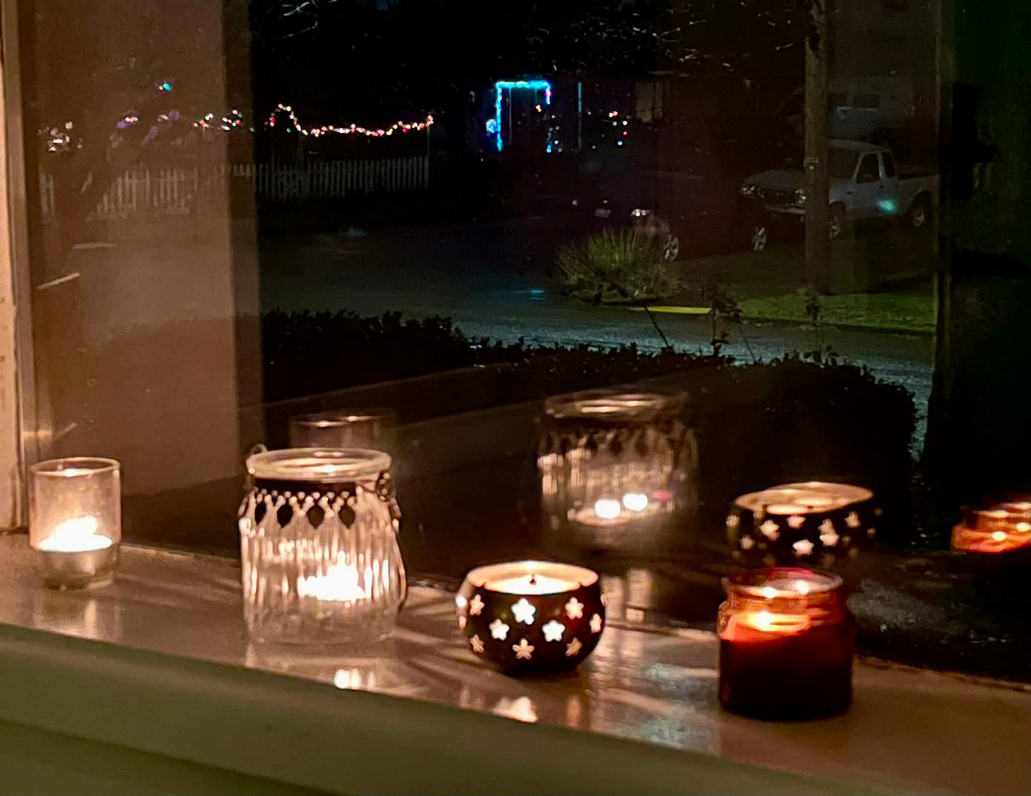 This is it, the hinge Of the year, the pivot Turning us back toward the light. I put candles In all the windows, Flames flickering brightly. Hold fast to the knowledge That everything changes, Constantly and forever. What we have now Will pass away, Make space for something new. Dawn on the horizon, That long summer day When darkness seems impossible.